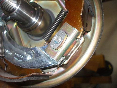 10 ドラムブレーキのバックプレートにある調整ネジがわかりやすいようにモンキーレンチを当ててみました。 |